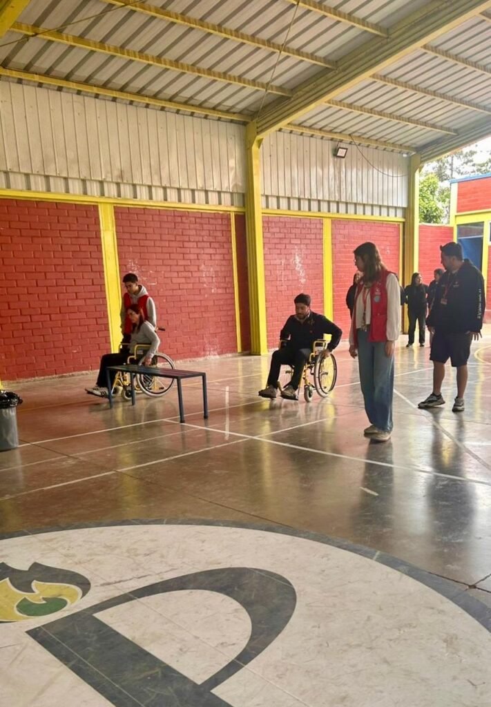 La actividad fue dirigida por voluntarios de Teletón de la Región del Maule, quienes visitaron ambas sedes —Básica y Media— el pasado jueves 6 de noviembre, desarrollando dinámicas en las que docentes y asistentes de la educación vivieron simulaciones de distintas situaciones de discapacidad. Durante la jornada, los participantes se desplazaron en sillas de ruedas y realizaron recorridos con los ojos vendados, experimentando las dificultades de movilidad y orientación que enfrentan diariamente las personas con discapacidad física o visual.