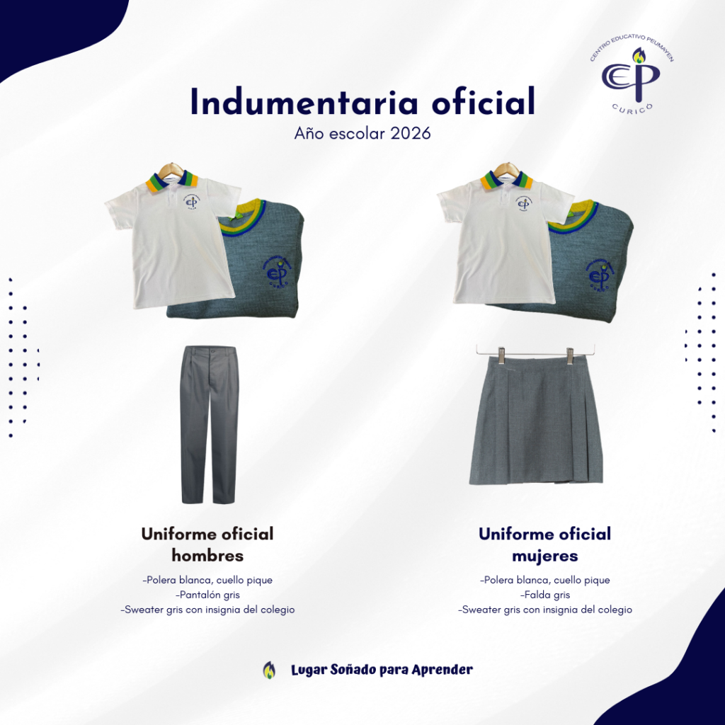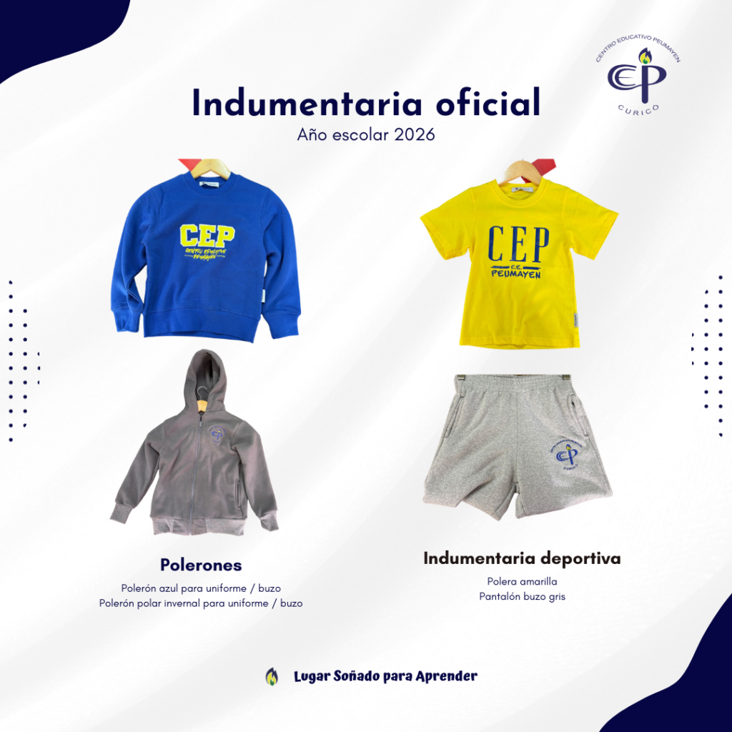 Recordamos a nuestra comunidad que los estudiantes de Educación Parvularia y Primer Ciclo (hasta 4° básico)utilizan una indumentaria deportiva institucional, pensada para brindar mayor comodidad durante sus actividades diarias. Adicionalmente, cada familia debe saber que todas las prendas deben corresponder al modelo oficial del establecimiento y mantener una presentación adecuada durante toda la jornada escolar.